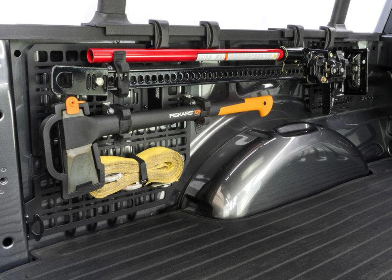 In the 2021+ F-Series lineup, each truck bed is equipped with four mounting points, know as the Boxlink system. Sadly, these don’t offer a great deal of flexibility when it comes to storing a variety of items. The BuiltRight Modular Bedside Rack System installs using these same factory mounting points, without the need for modification to the vehicle. The panels provide MOLLE-compatible features for the use of MOLLE/PALS accessories in addition to universal slots for an infinite number of possibilities. These panels also provide clearance for the Ford ProPower panel and plugs.