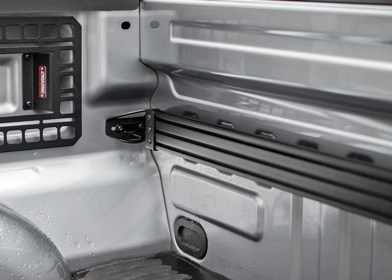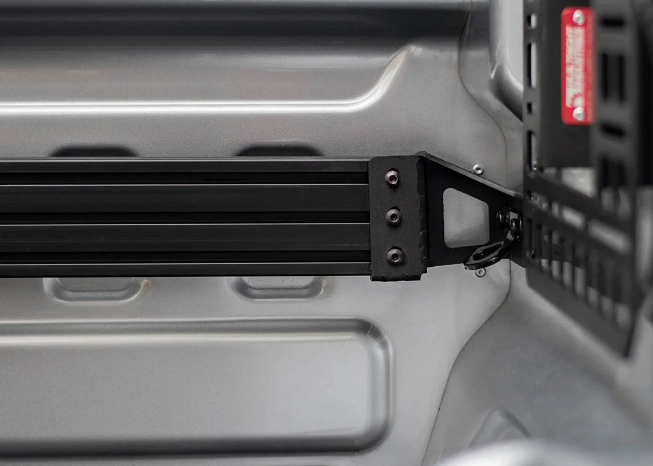 Installation of the BuiltRight Bulkhead Accessory Rail is very straight forward. First, connect the two extrusion pieces using the included hardware and the connecting bracket. Then, connect the two end brackets loosely. Next, remove the tie-downs in either side of the bed using a T30 torx and move the BAR assembly into place. You make choose to replace the factory tie-downs but the BAR brackets can serve the same purpose. Tighten brackets to bedside before tightening the hardware connecting the brackets to the rail itself. Checkout the install video.
