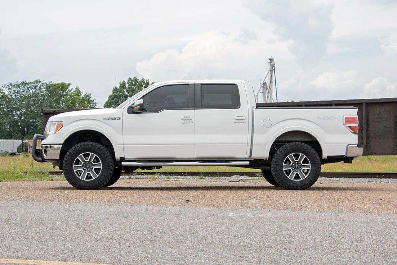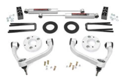 Rough Country’s 3in Bolt-On Kit offers easy installation and aggressive good looks at an incredible value. Take your truck to new heights with this excellent option for 09 and up F-150 pickups.This kit features a set of high-quality, tubular Upper Control Arms designed to make alignment adjustments easier and Clevite rubber bushings for enhanced durability. These arms are designed to promote a factory-like geometry by keeping the ball joint at optimum angles after lifting. This design allows for an improved, greater range of motion from the ball-joint, with less stress, wear and tear.Rough Country’s 3-inch Bolt-On Kit features N3 Nitrogen-charged shocks, giving your truck incredible ride-quality both on and off-road. Also included are a set of durable strut spacers and fabricated rear blocks to provide lift height from front to rear. Once installed, this kit gives your truck plenty of ride height for up to 34in tires while offering a clean, level look from front to rear. Retain your stock wheels with this kit when you use Rough Country’s 0.25-inch wheel spacer.This all-inclusive kit comes with everything you need, and installation is a piece of cake compared to other kits on the market! Featuring a 100% bolt-on installation process that requires zero cutting or drilling, this kit can be installed using common tools in a home garage, and allows the truck to be returned to stock at any time if so desired. Best of all this kit features Rough Country’s Lifetime Replacement Warranty.