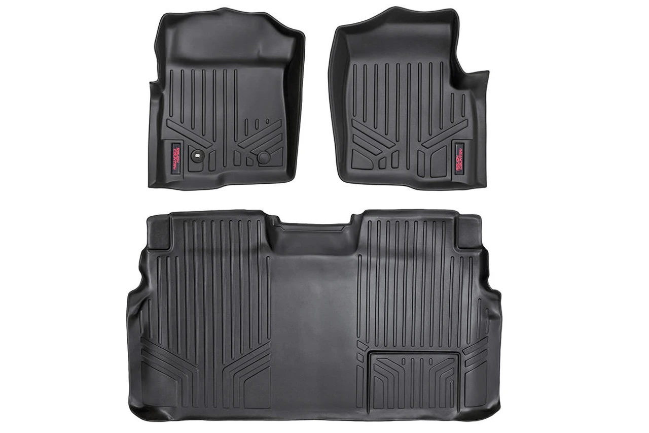 Keep your carpet in pristine condition with Rough Country’s Floor Armor: Heavy Duty Floor Mats and Rear Cargo Liners. These eco-friendly, semi-flexible floor mats are made of an ultra-durable Polyethylene that offers a strong, rigid shape that’s incredibly easy to clean. Where simple rubber floor mats fail, Rough Country’s line of Floor Armor is guaranteed for life and will never crack, split, or break-down over time. The high-quality design extends the lifespan of your carpets and the raised-lip design ensures your interior will always be protected from mud, moisture, and more. These contoured floor mats are laser-measured for each make and model; designed to be a precise fit that grips the carpet and stays put. An aggressive looking textured surface gives your muddy shoes plenty of traction and looks great inside the vehicle. No matter what you track in, Rough Country Floor Armor is incredibly easy to clean. Just pop them out of the floorboards and rinse away the dirt! Includes Rough Country’s Lifetime Replacement Warranty.